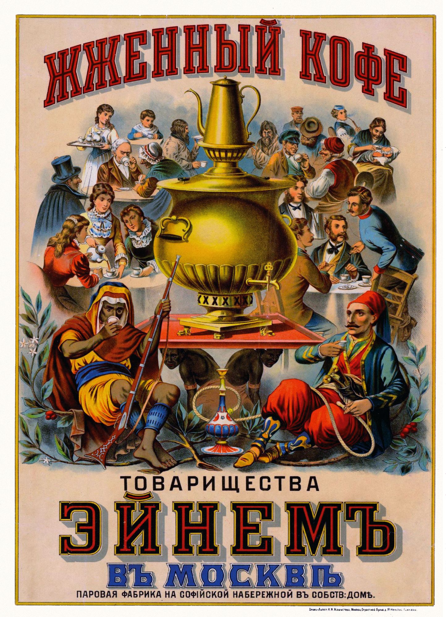 Жженый кофе производила и фирма «Эйнем», сделав его популярным благодаря своим ярким и красочным плакатам.
