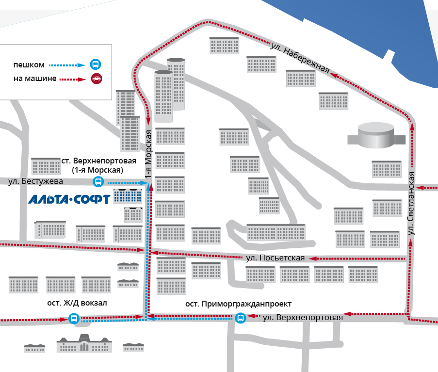 Центральный вход в здание, подняться на четвертый этаж на лифте, при выходе из лифта повернуть направо, пройти вдоль коридора, офис 419, Дальневосточный филиал «Альта-Софт».