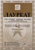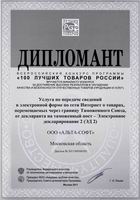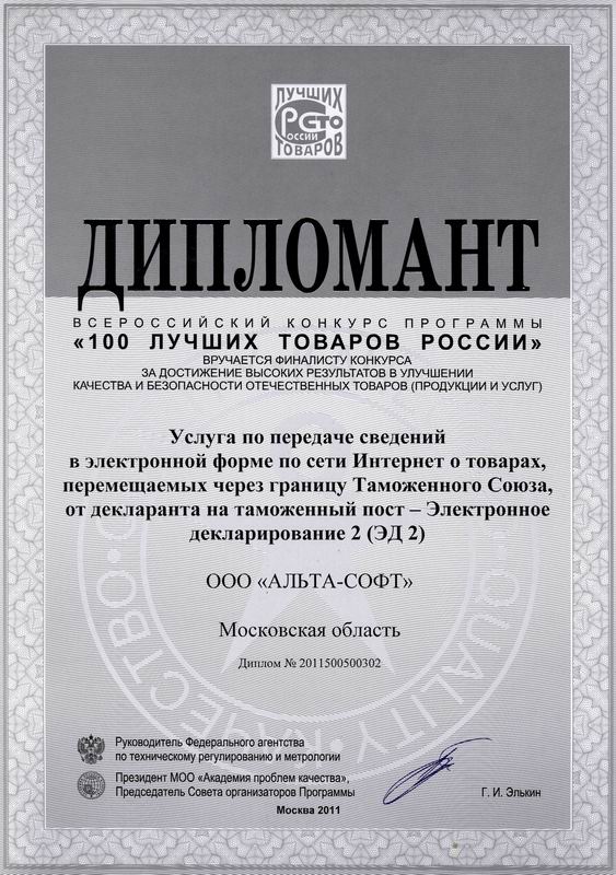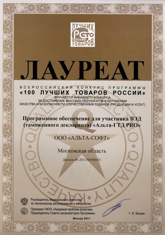 В конце 2011 года были подведены итоги всероссийского конкурса «100 лучших товаров России». За достижение высоких результатов в улучшении качества и безопасности отечественных товаров и услуг компания «Альта-Софт» была отмечена в двух номинациях конкурса на федеральном уровне и получила почетный знак «Отличник качества». Дипломами награждены программа заполнения таможенных документов «ГТД-PRO» и услуга по передаче сведений в электронной форме по сети Интернет (электронное декларирование по схеме ЭД-2). |