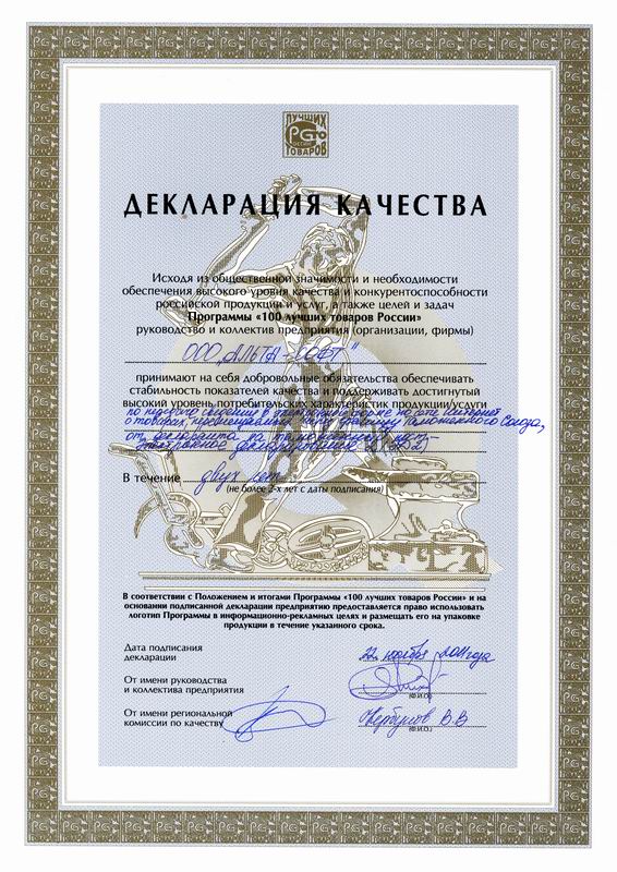 Компания «Альта-Софт», подписав Декларацию качества приняла на себя добровольные обязательства обеспечивать стабильность показателей качества и поддерживать достигнутый высокий уровень потребительских характеристик своих продуктов и услуг.