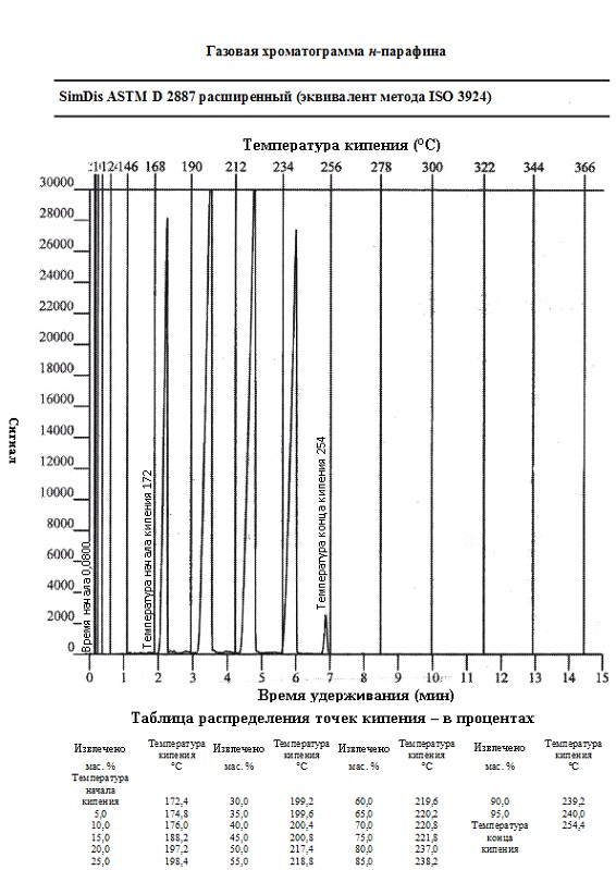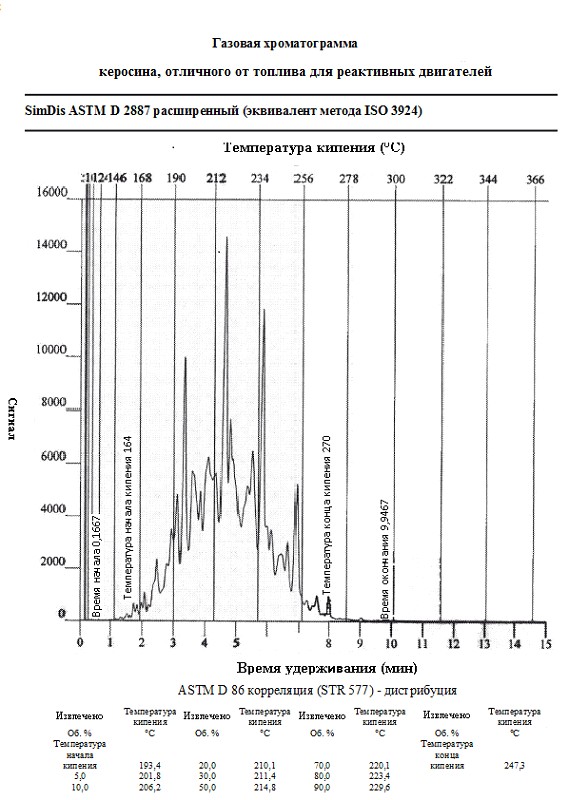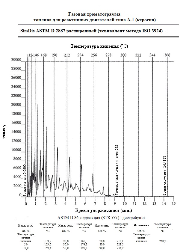 Газовая хроматограмма топлива для реактивных двигателей керосинового типа, например, наиболее часто используемого топлива для реактивных двигателей А–1, является характеристикой нефтепродукта, полученной только путем перегонки сырой нефти (и никаким другим процессом). Длина цепи алканов варьируется примерно между 10 и 18 атомами углерода. Интервал кипения фракции по методу EN ISO 3405, эквивалентному методу ASTM D 86, составляет приблизительно от 130 до 300 °C. Содержание ароматических веществ может достигать 25 об.%. Его температура вспышки, как правило, выше 38 °C по методу ISO 13736.