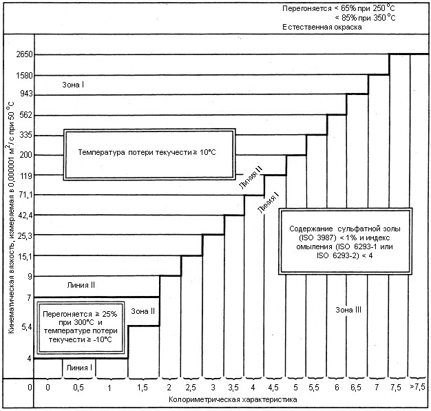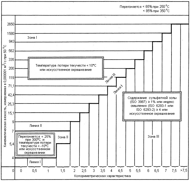 а) не более, чем показано в строке I Таблицы соответствия колориметрических характеристик в растворе К и вязкости В, приведенной в дополнительном примечании 2 (е) к данной группе, при содержании сульфатной золы 1% или более, или при индексе омыления 4 или более; или