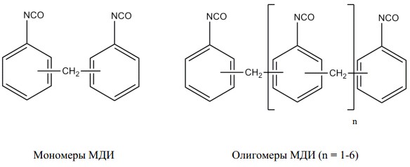 Полиметиленфенилизоцианат (часто называемый "сырой МДИ", "полимерный МДИ" или "полидифенилметандиизоцианат") представляет собой жидкость, варьирующуюся от непрозрачной темно–коричневой до прозрачной светло–коричневой, и которая получается путем взаимодействия анилина и формальдегида с образованием смеси олигомеров метиленфениламина, которая затем реагирует с фосгеном и при нагревании образует изоцианатные функциональные группы. Продукт является химически модифицированным полимером анилина и формальдегида (химически модифицированная аминосмола). Он содержит собственно МДИ и смеси МДИ олигомеров. Химические структуры см. ниже: