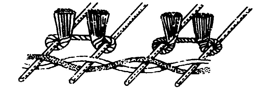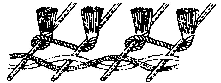 (2) Узел Сенна, или иранский ковровый узел: ворсовая нить обкручивается вокруг одной основной нити и затем пропускается под следующей основной нитью (см. рис. 2), оба конца направляются вверх для образования поверхности ковра.