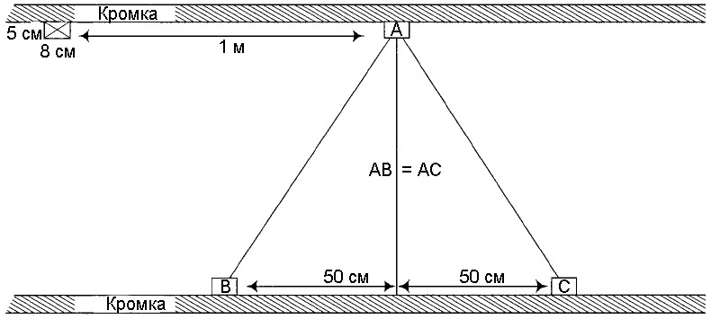 - отметка, состоящая из прямоугольника с отмеченными диагоналями, должна воспроизводиться через регулярные промежутки по обоим краям ткани, не попадая на кромку, так, чтобы расстояние между двумя последовательными отметками, измеренное между прилегающими концами прямоугольников, было не более одного метра и чтобы отметки по одному краю были расположены в шахматном порядке по отношению к отметкам на другом крае (центр каждой отметки должен быть равноудален от центров двух ближайших отметок на противоположном конце ткани);
