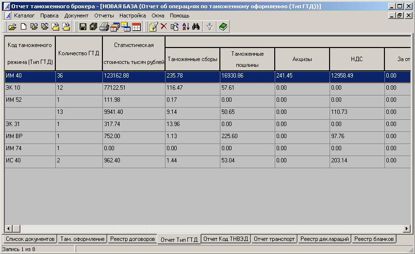 Позволяет сформировать форму отчетности таможенного представителя в соответствии с требованиями приказа ФТС России от 28.12.2010 г. № 2636, все виды отчетов согласно приказу ФТС России от 03.10.2012 г. № 2012, ряд дополнительных отчетов.