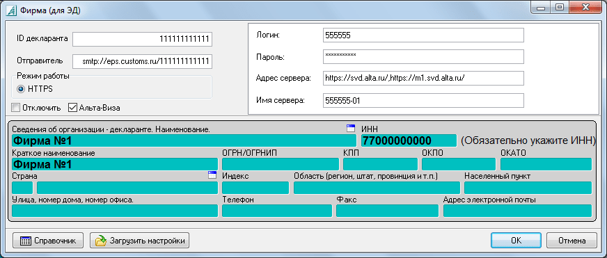 Меню Настройка|Сетевые настройки и сервер|ЭД фирмы: